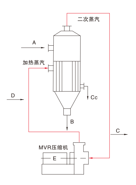 После сжатия компрессором вторичный пар повышается в давлении и температуре, что приводит к увеличению тепловой энтальпии. Затем он поступает в нагревательную камеру испарителя и используется в качестве греющего пара (т.е. острого пара) для поддержания растворенного материала в испаряющемся состоянии, при этом сам греющий пар отдаёт тепло материалу и конденсируется в воду. Таким образом, пар, который изначально должен был быть отведён, полностью используется, рекуперируя скрытую теплоту и повышая тепловой КПД.